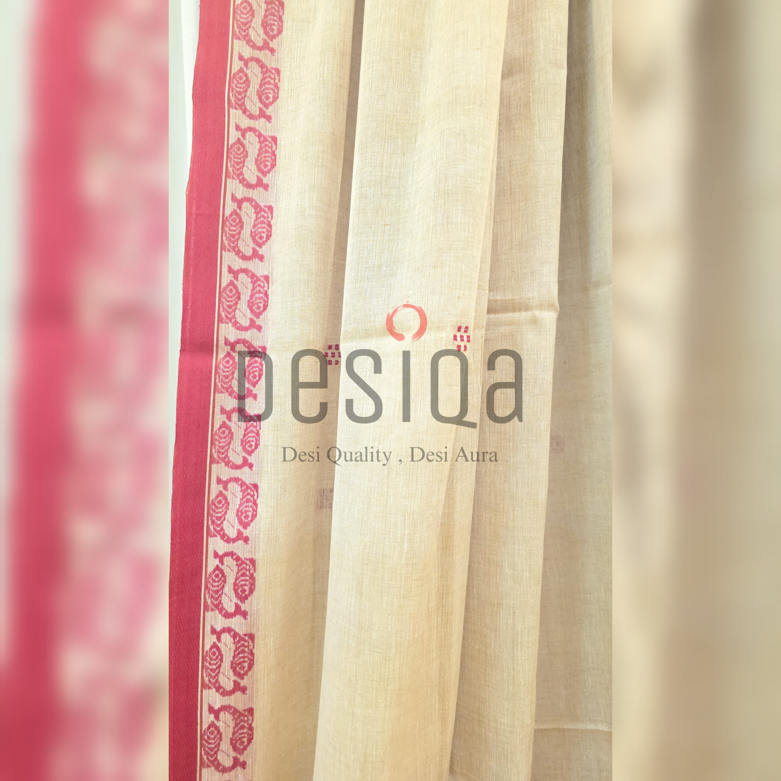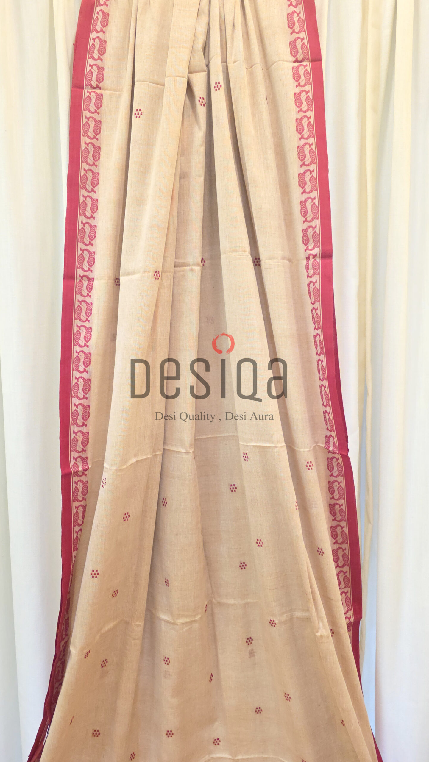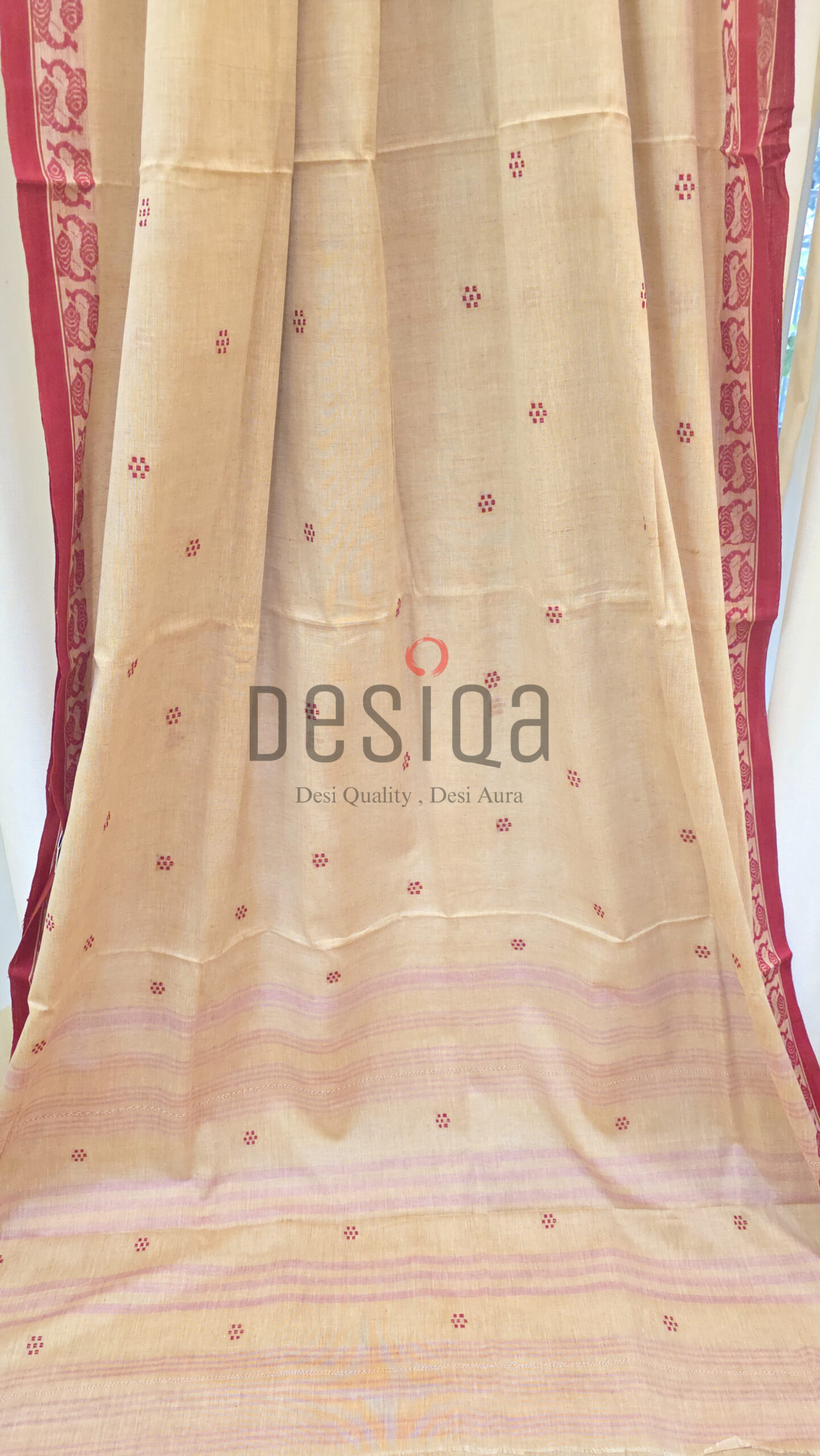 Beige Colour Red Fish Par Pure Cotton Dhonekhali Handloom Sarees