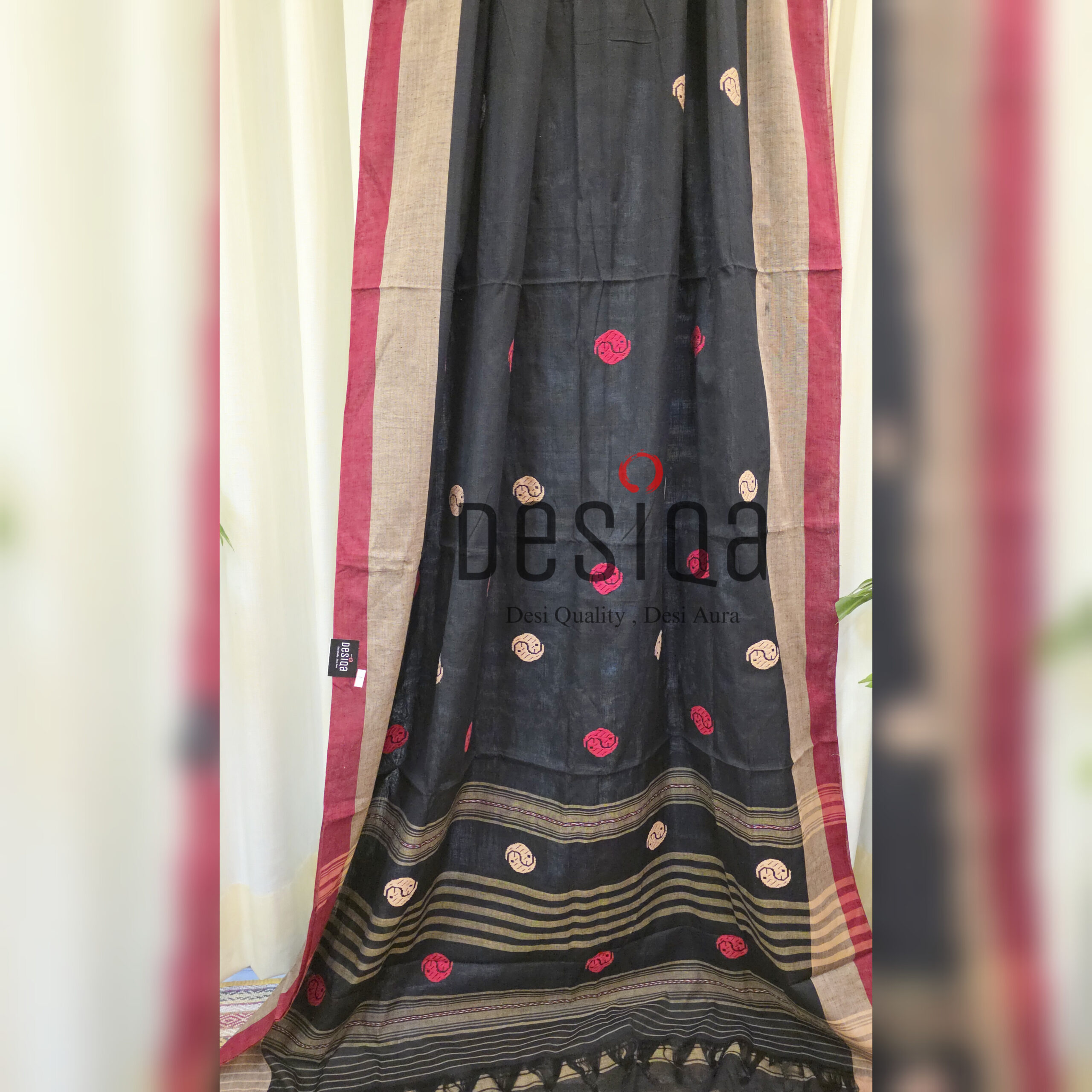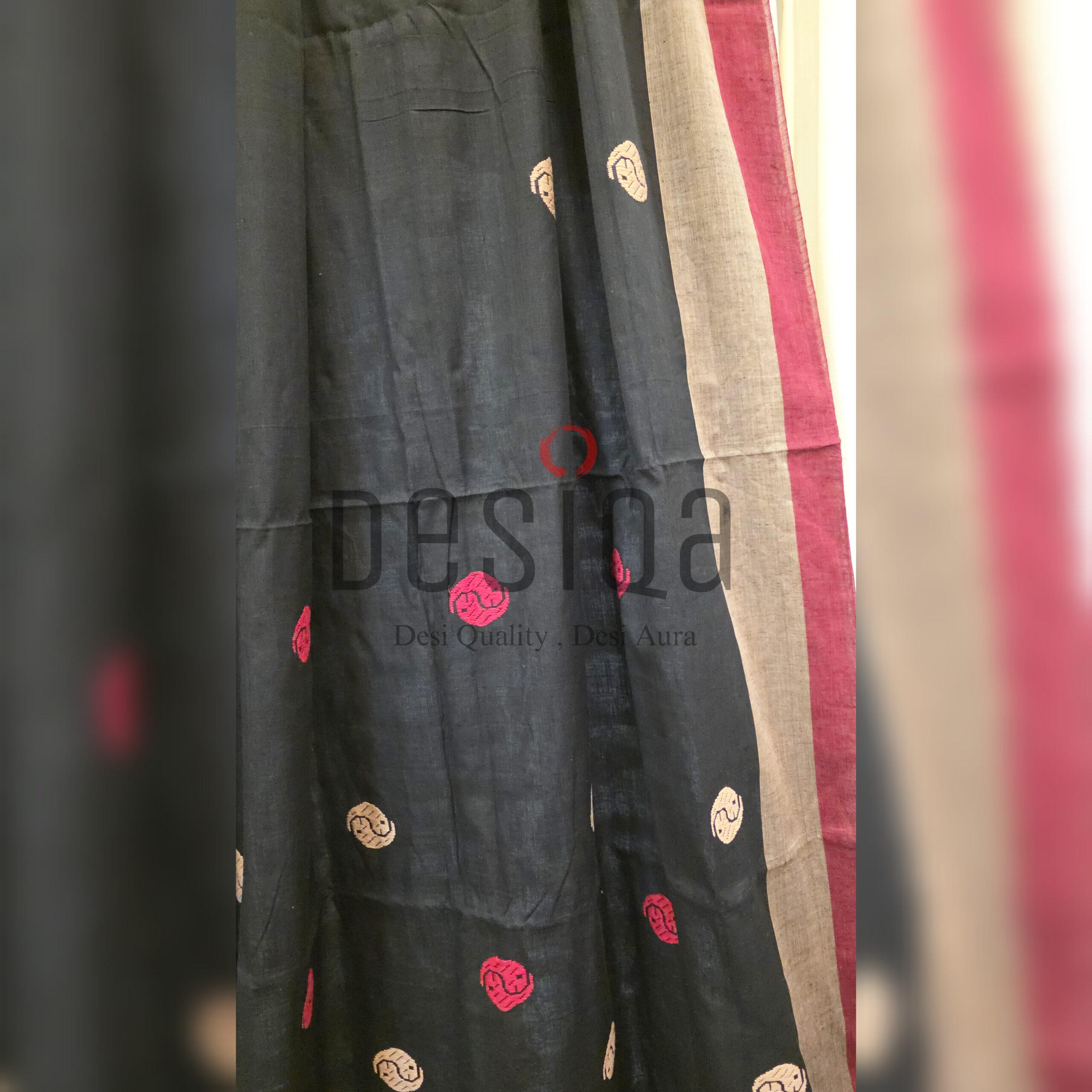 Black Colour Dual FIsh Motifs Dhonekhali Handloom Saree