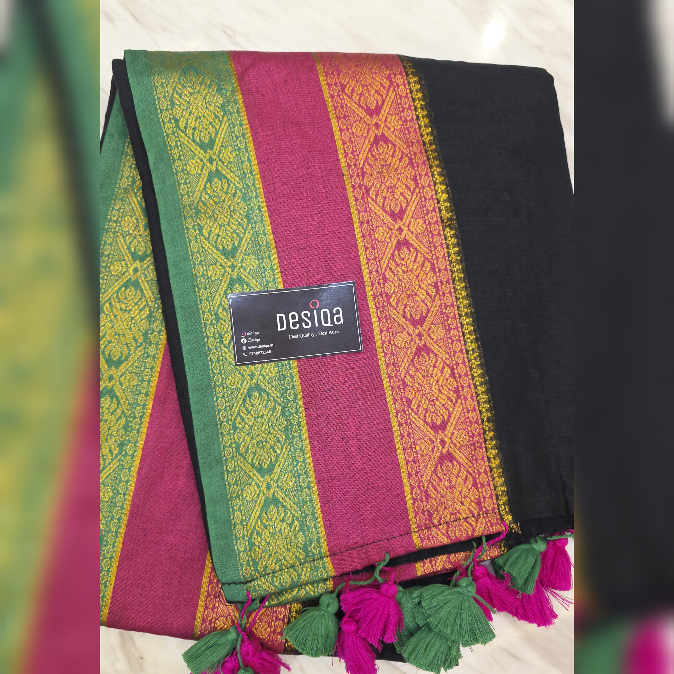 Design:Â Black with Pink & green Kanchi Border