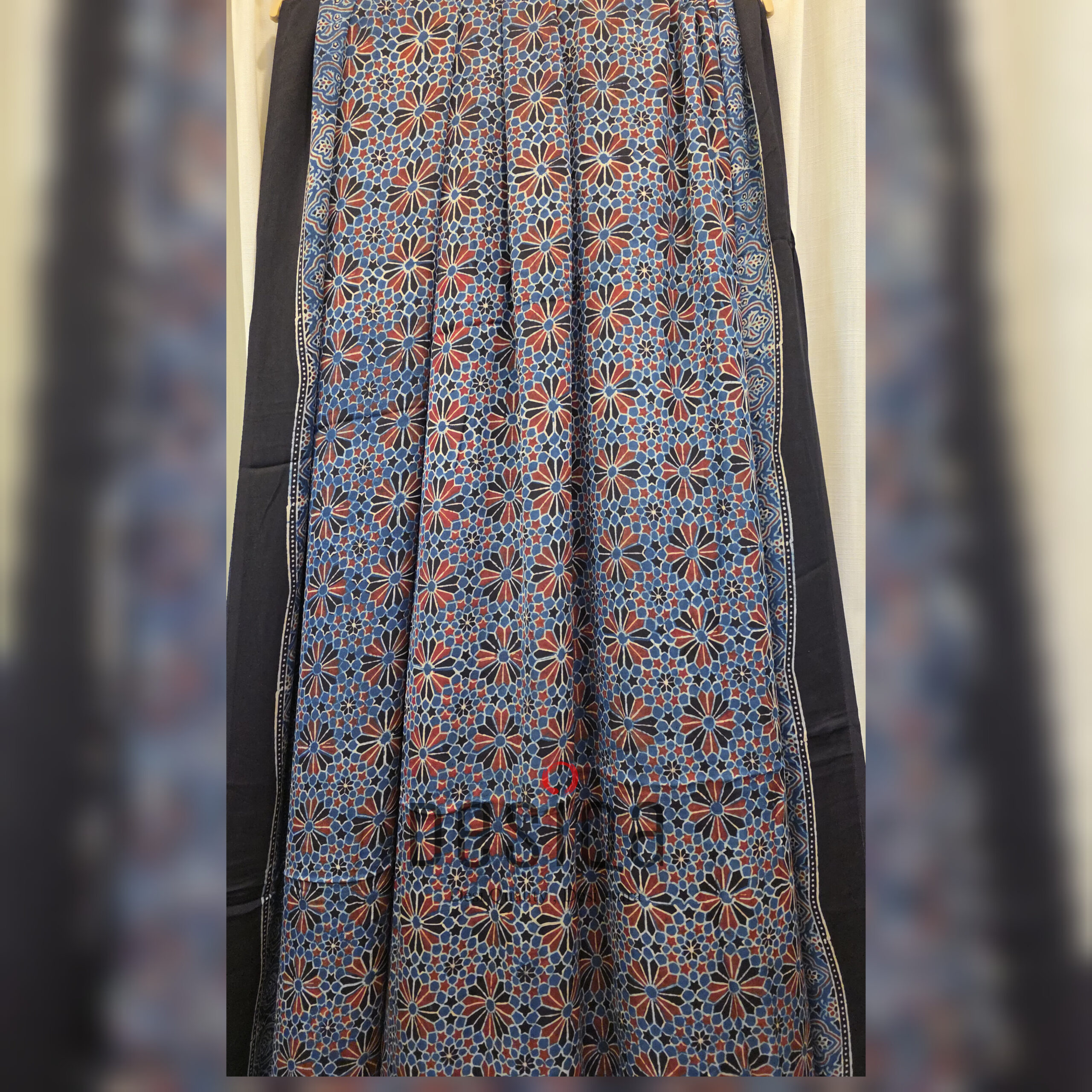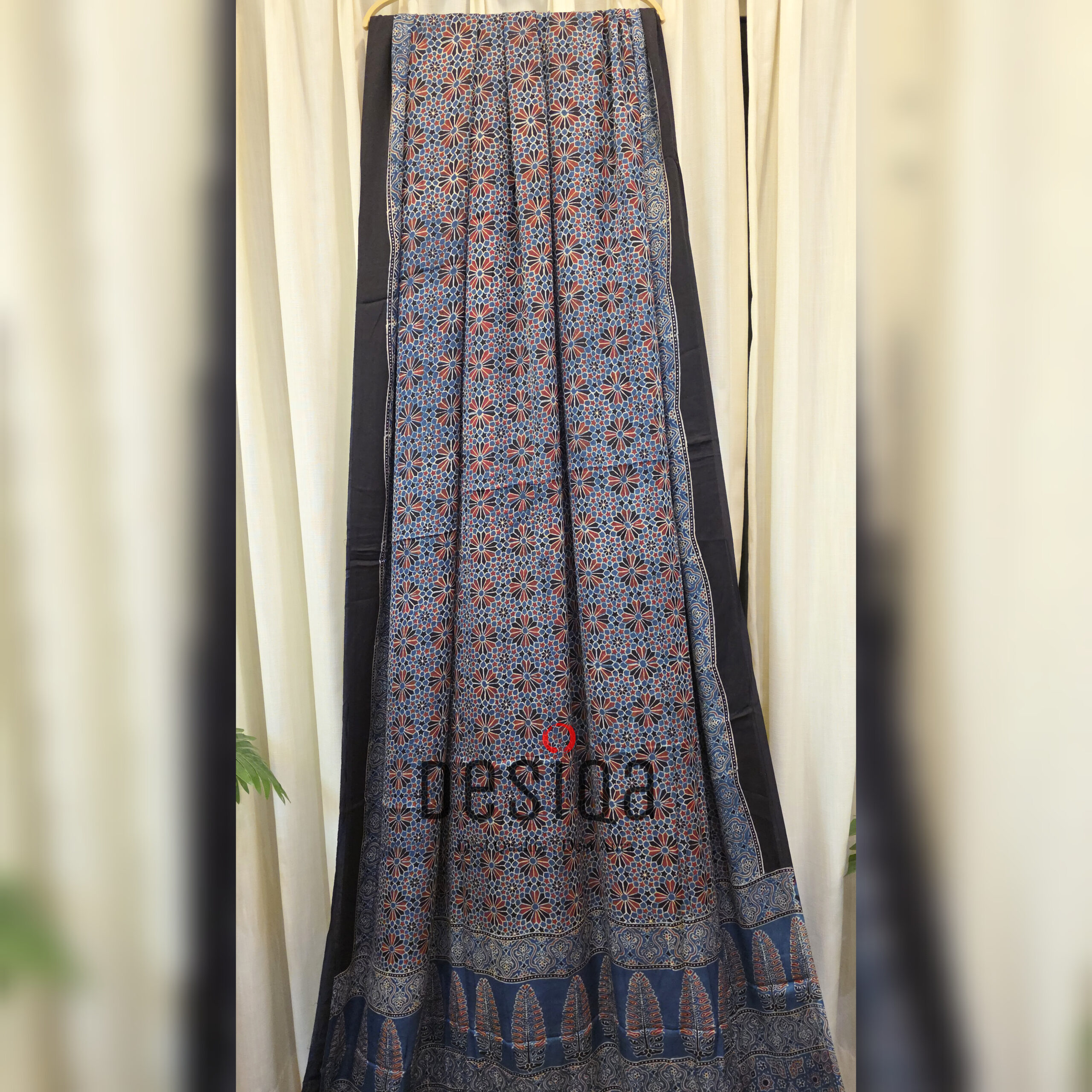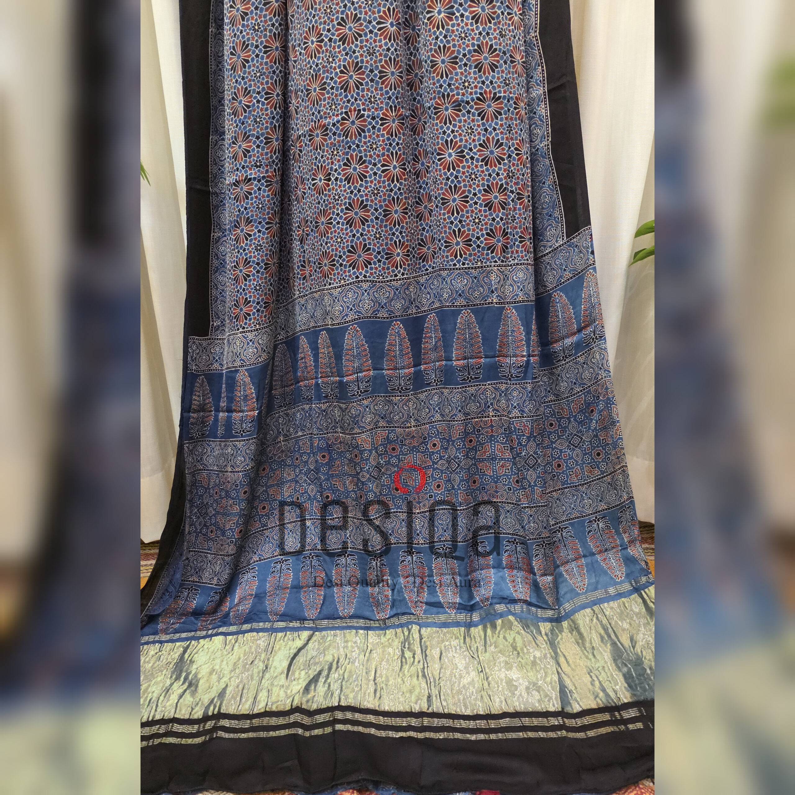 Design:Â Â Â Â Â Â Â Â Â Â Ajrakh Block Print with Tissue Pallu