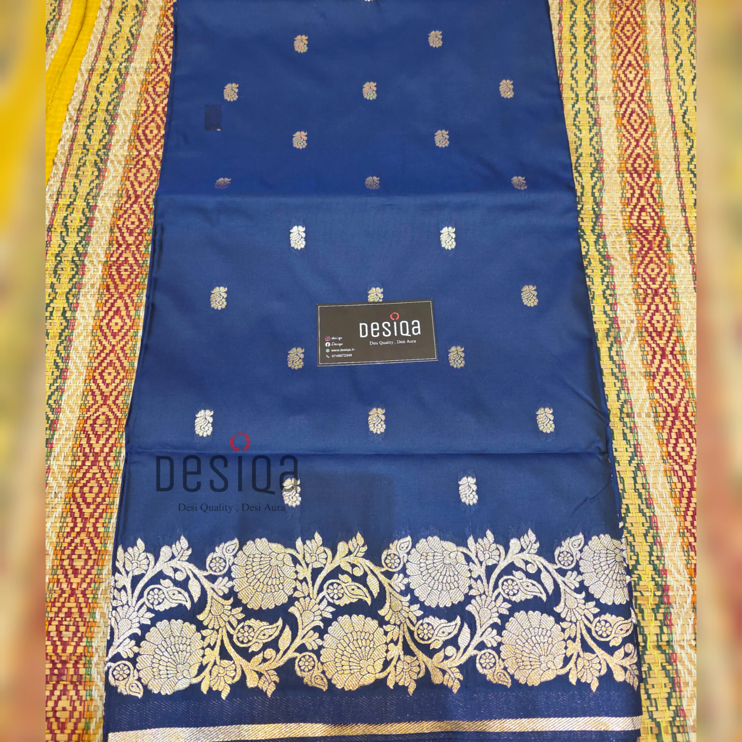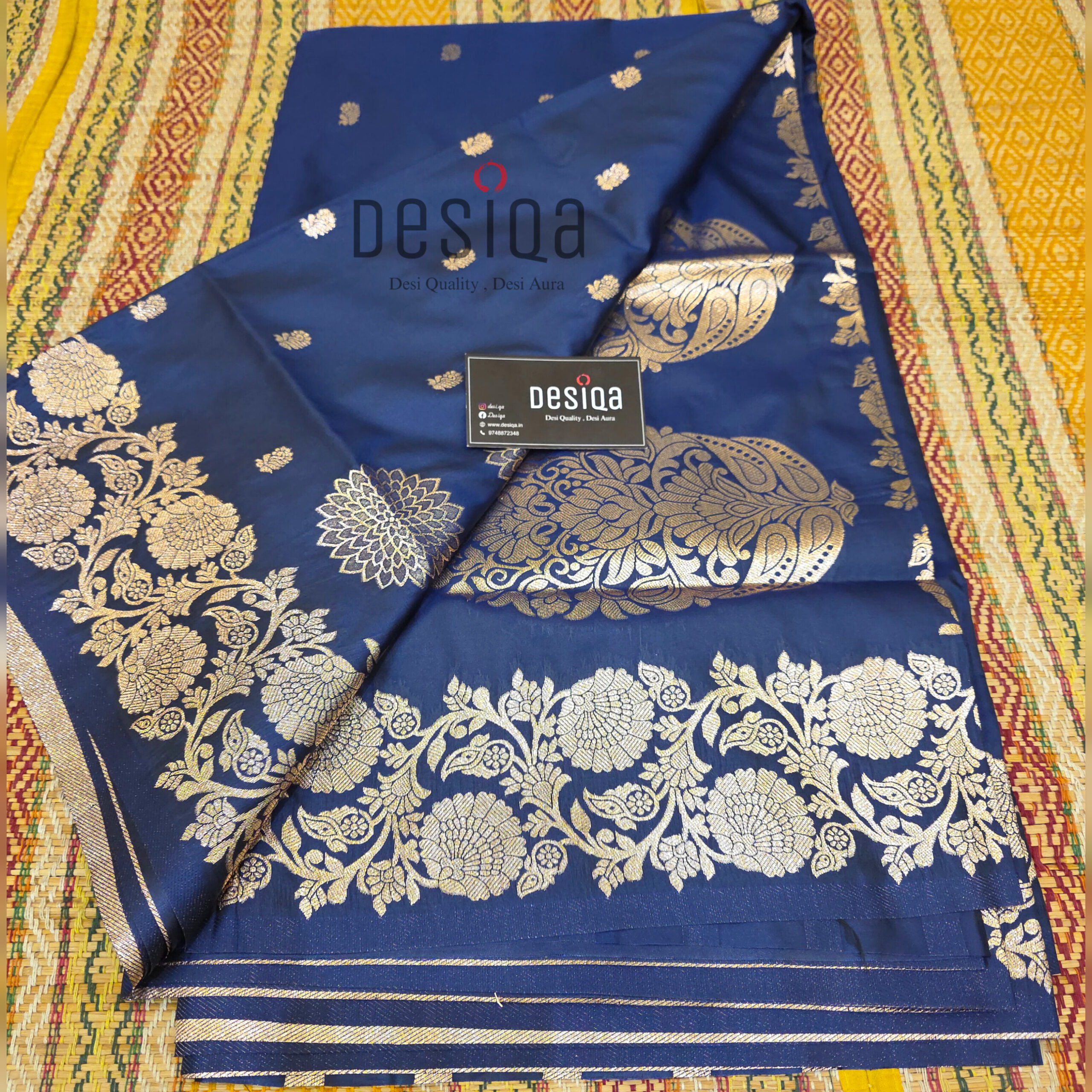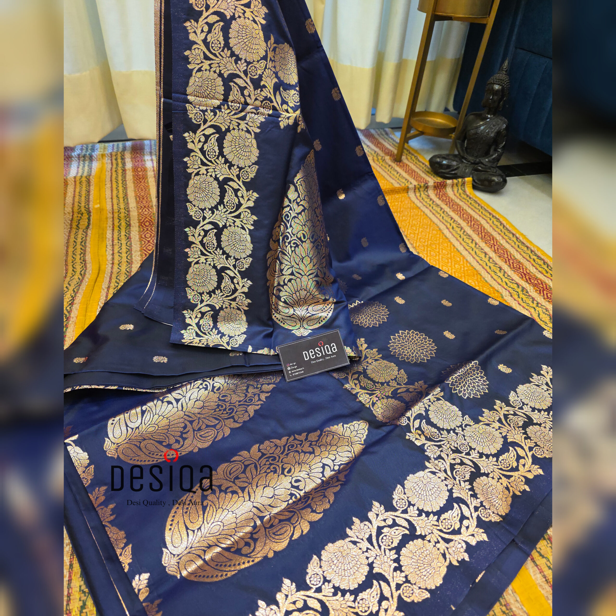 This saree is incredibly glamorous and makes you look stunning. It’s a wonderful display of traditional weaving. The mix of deep dark blue and bright old-style gold colors makes it look rich and royal. It’s made from a good-quality Semi-Silk fabric, so it has a nice shine, holds its shape well, and falls beautifully when you wear it