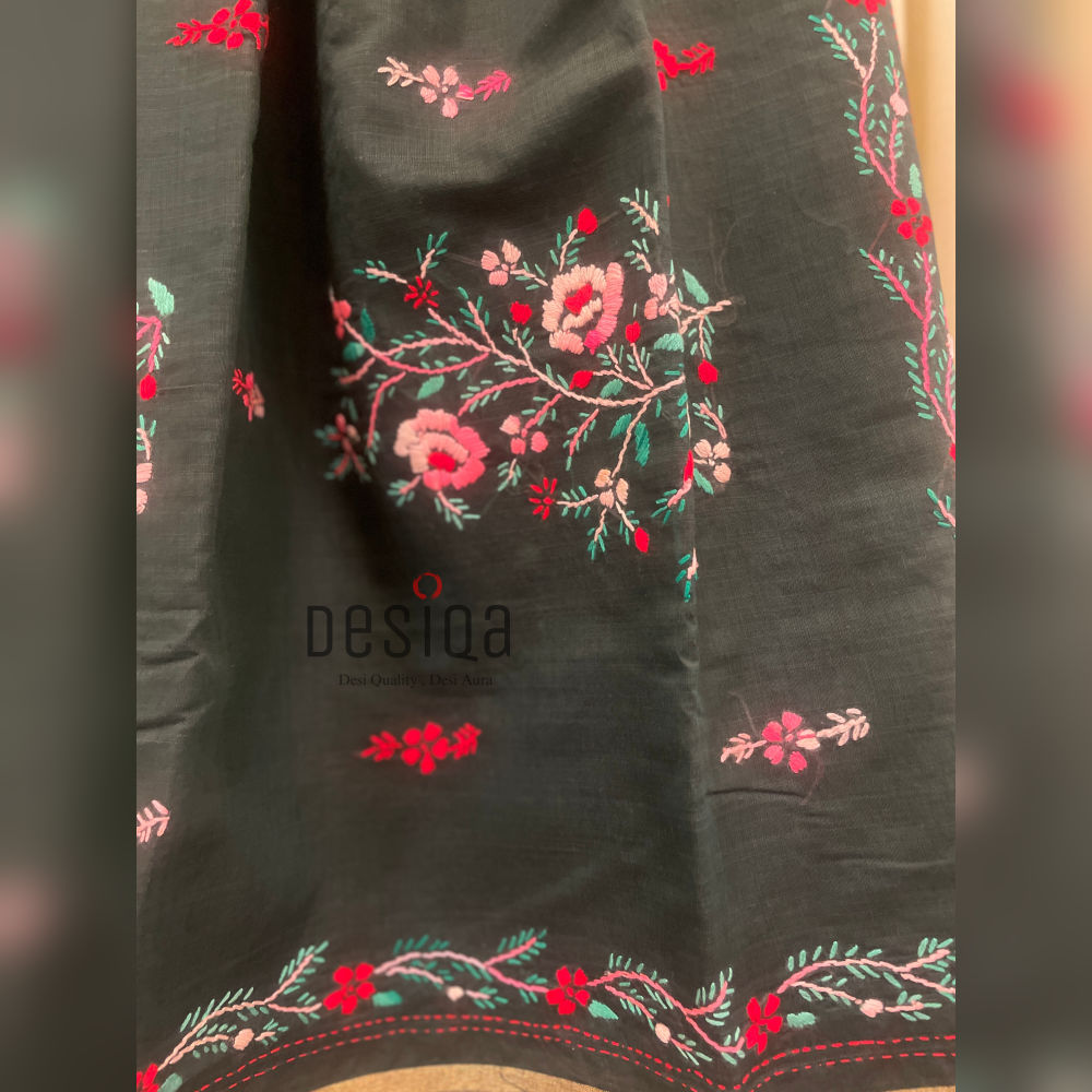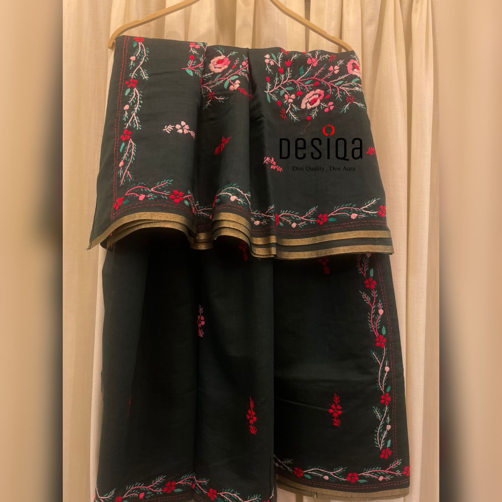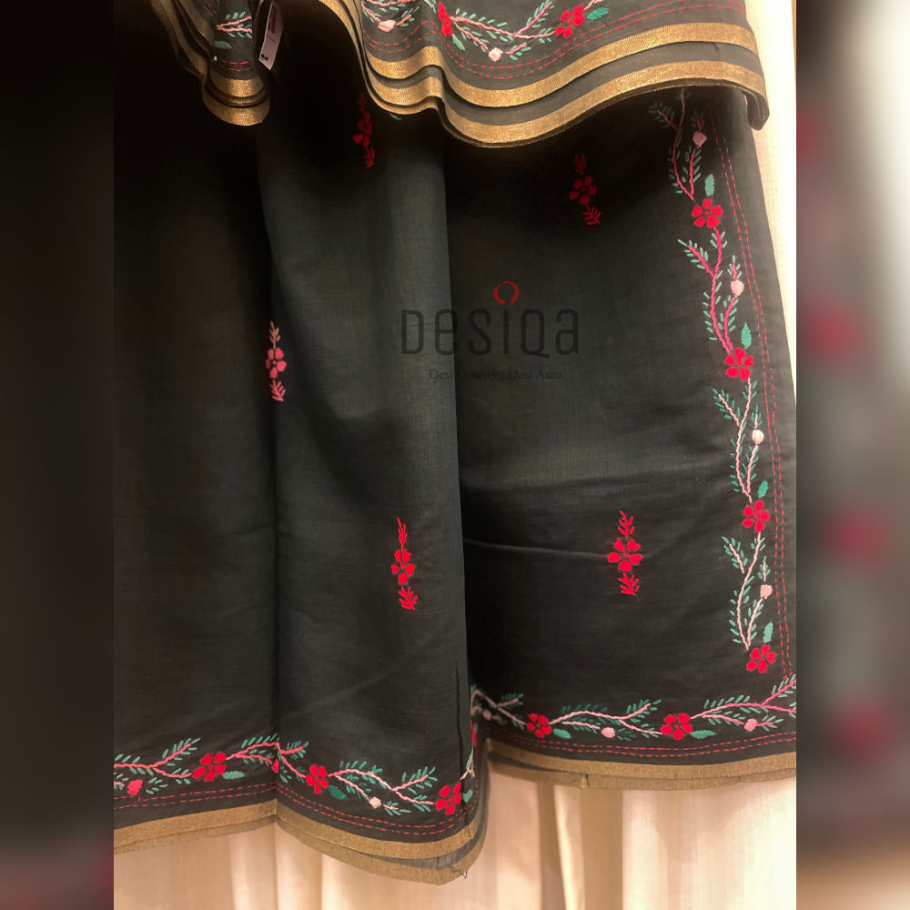 Just picture this! You’ll feel elegant and beautiful when you wear this unique saree. It has pretty hand-stitched flowers all over the main part and the border. The flowers are bright pink, red, and light blue, making them really stand out against the dark background. The edge has a shiny gold line (Zari) woven into it. This makes the saree look rich and perfect for parties.