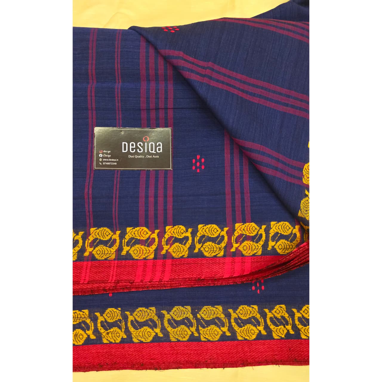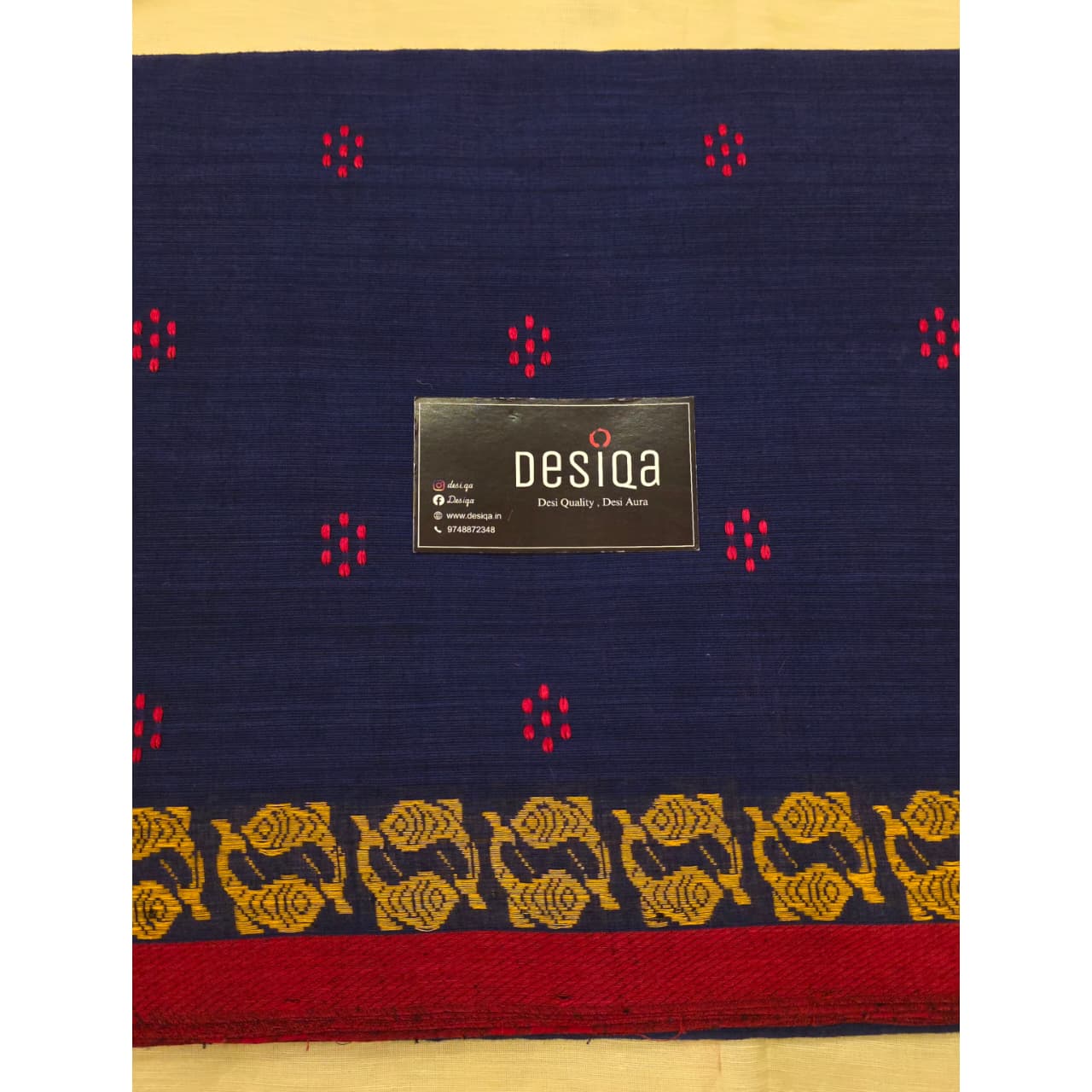 Design: Deep Blue with Yellow Fish handwoven Par and red simple border
