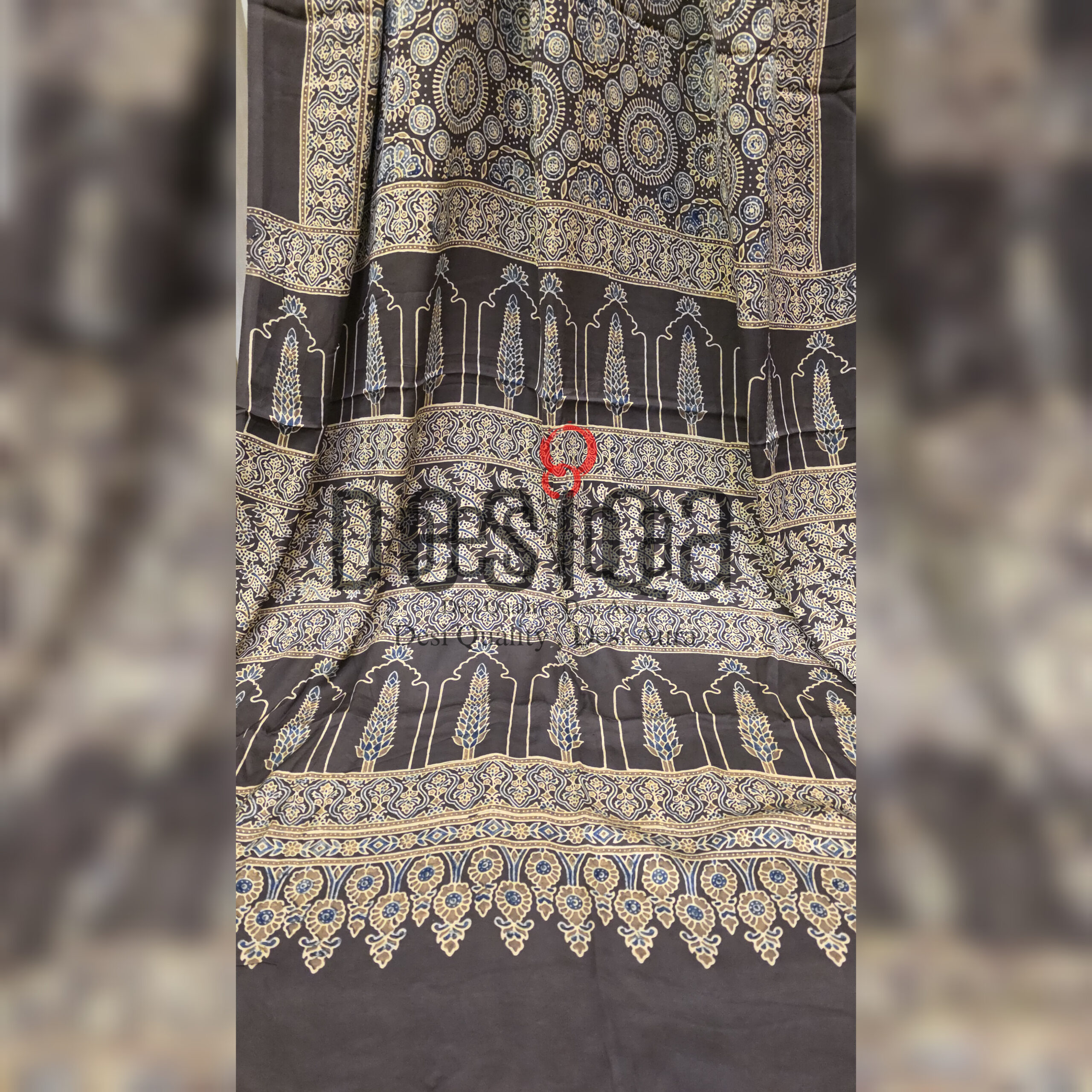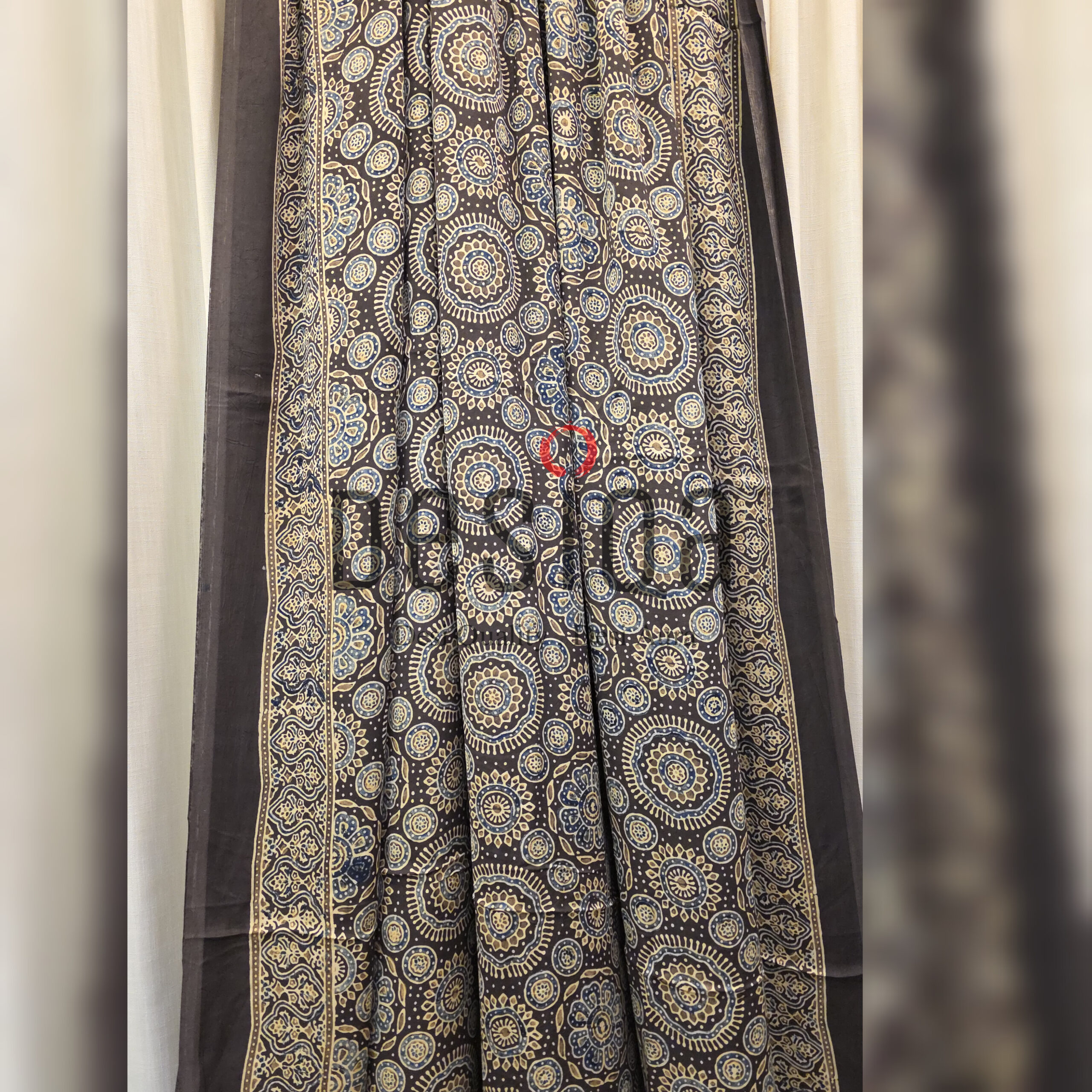 Grey-Yellow Colour Pure Hand Block Ajrakh Print Modal Silk Saree