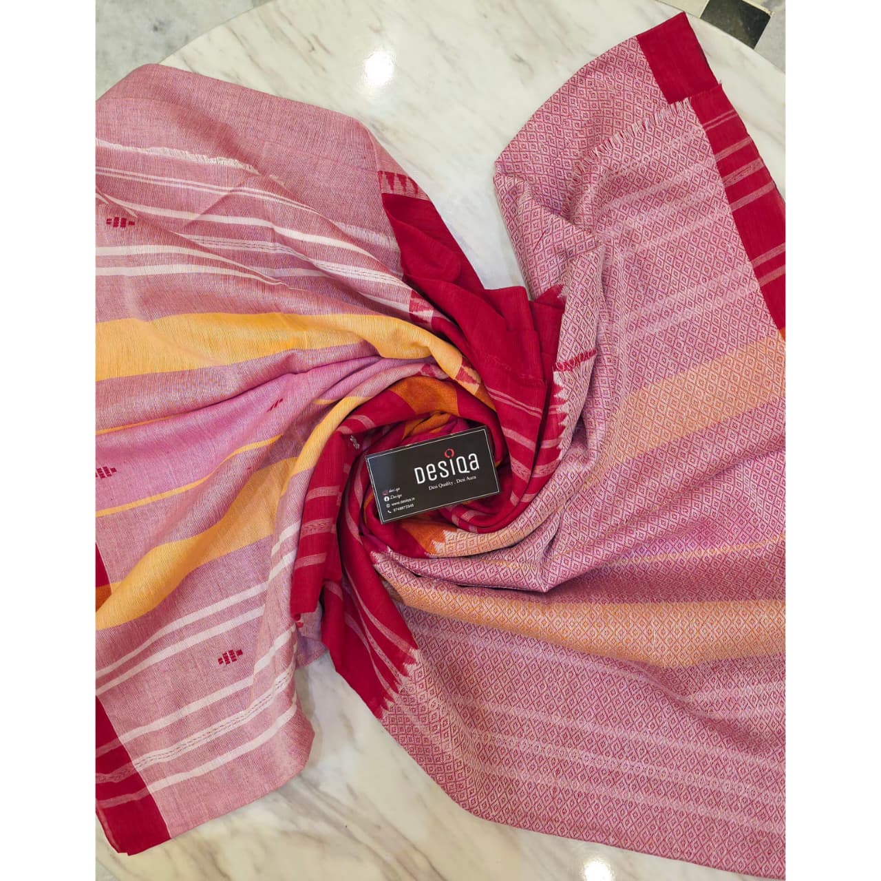 Design: Hand Woven Work with Brocade design and yellow white stripes, red border