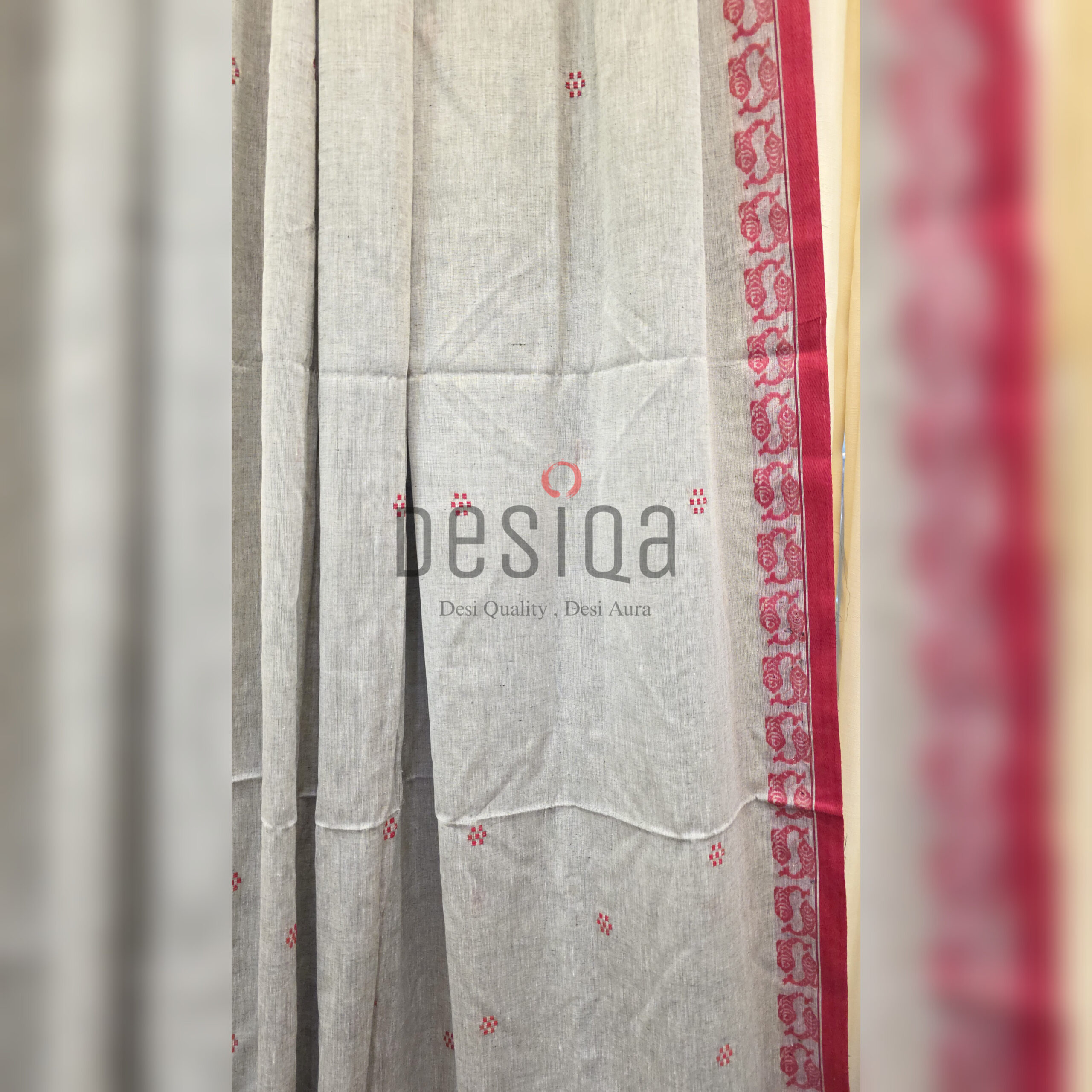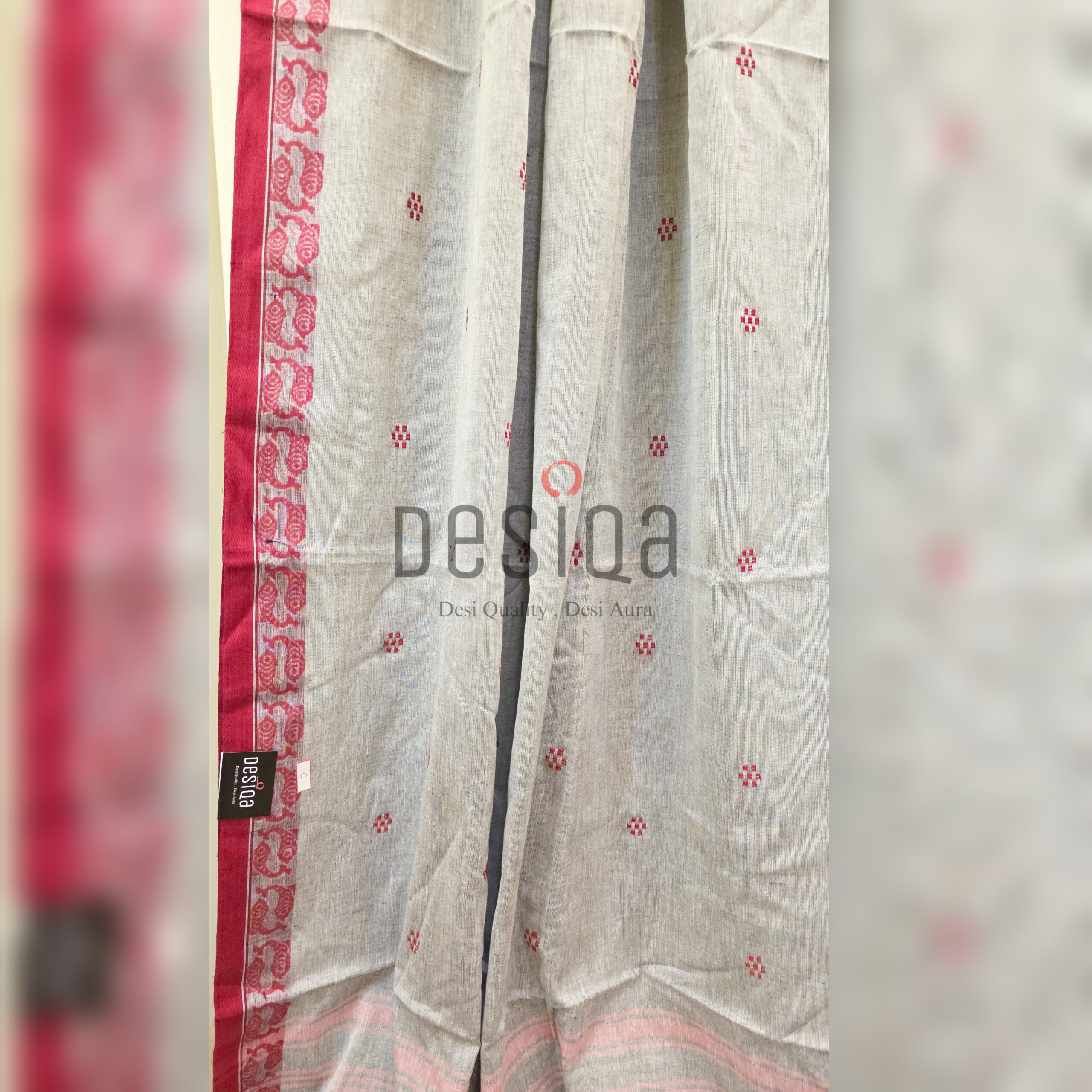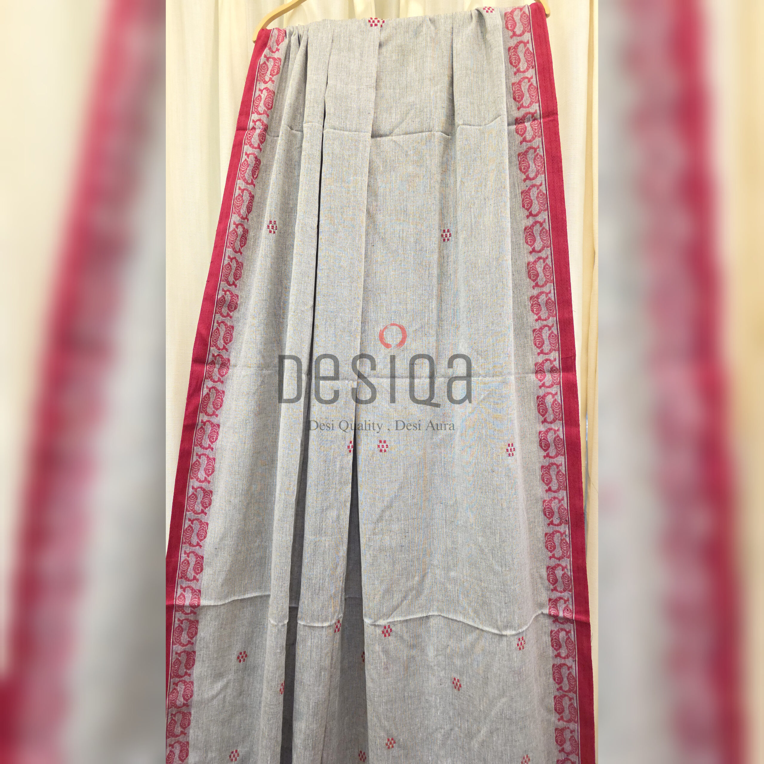 Silver Colour Red Motifs FIsh Par Dhonekhali Handloom Saree
