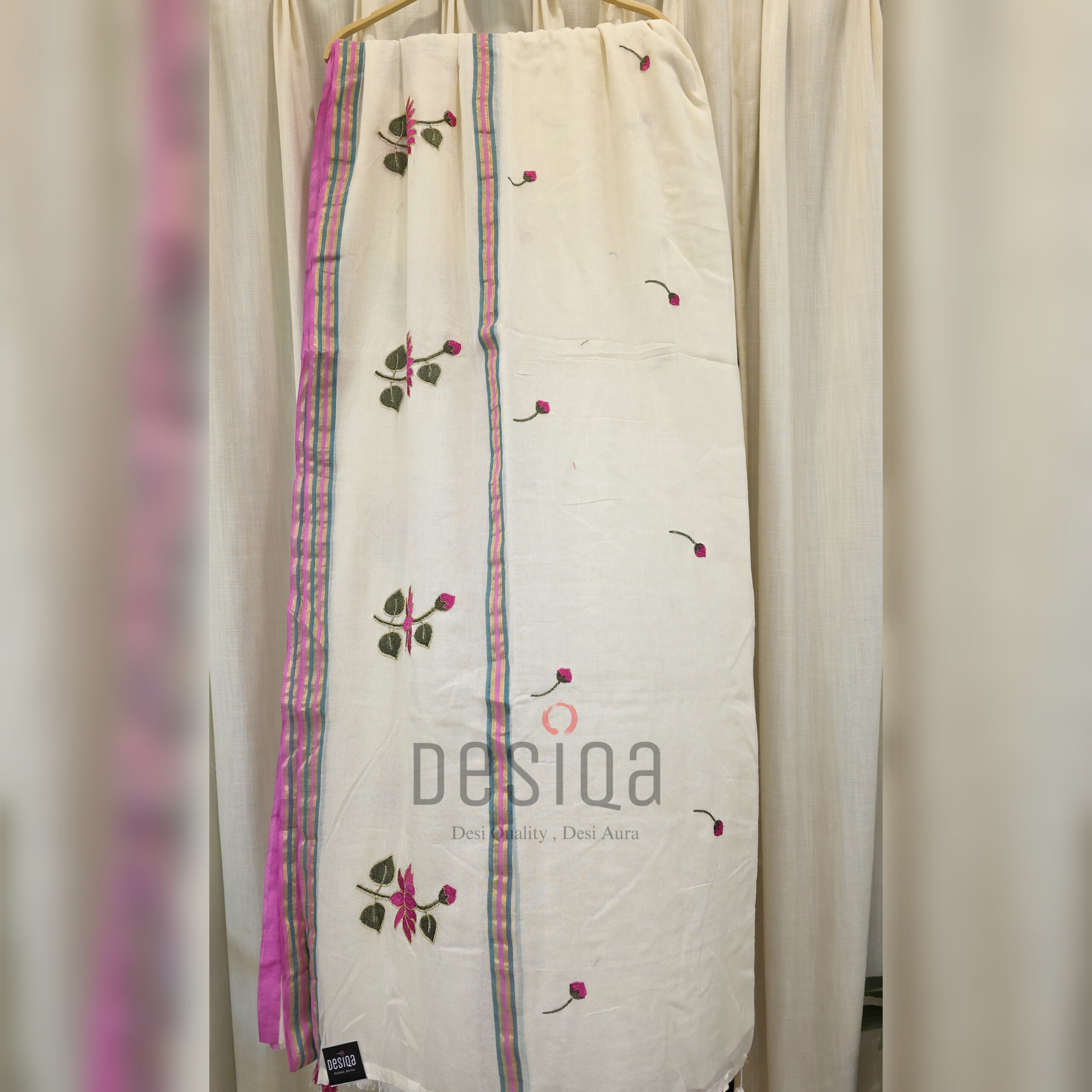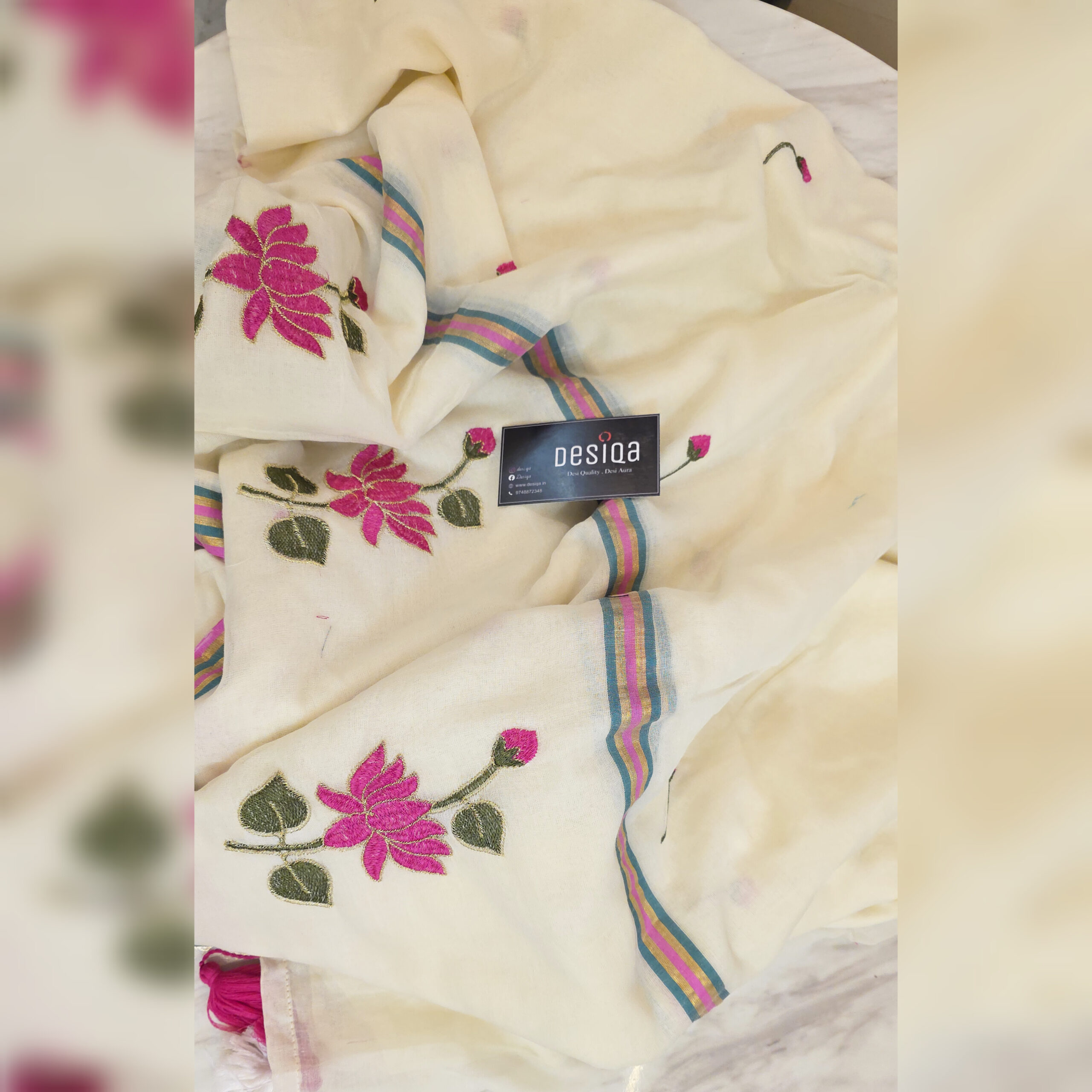 Off-White Colour Flower Motifs Mul Mul Cotton Saree