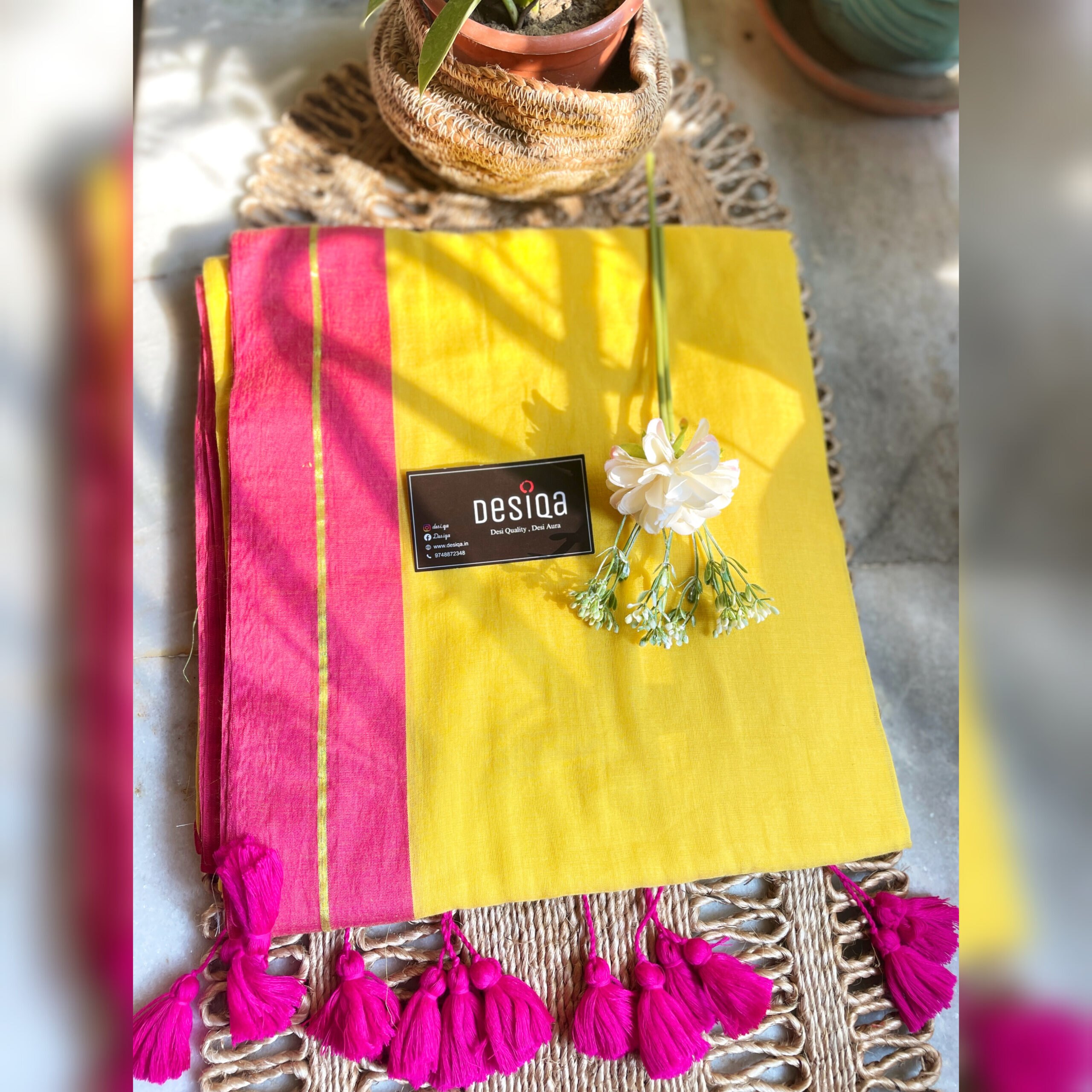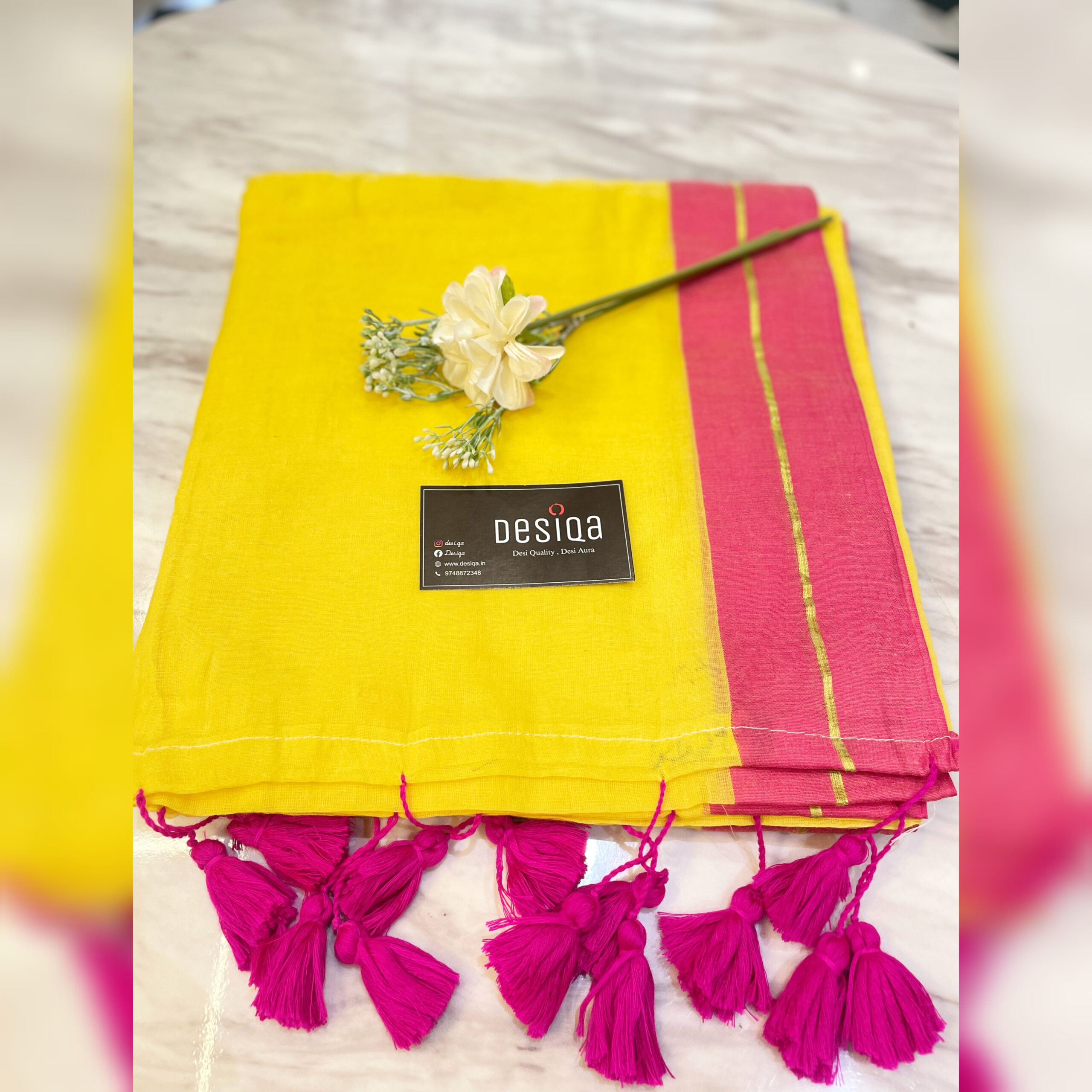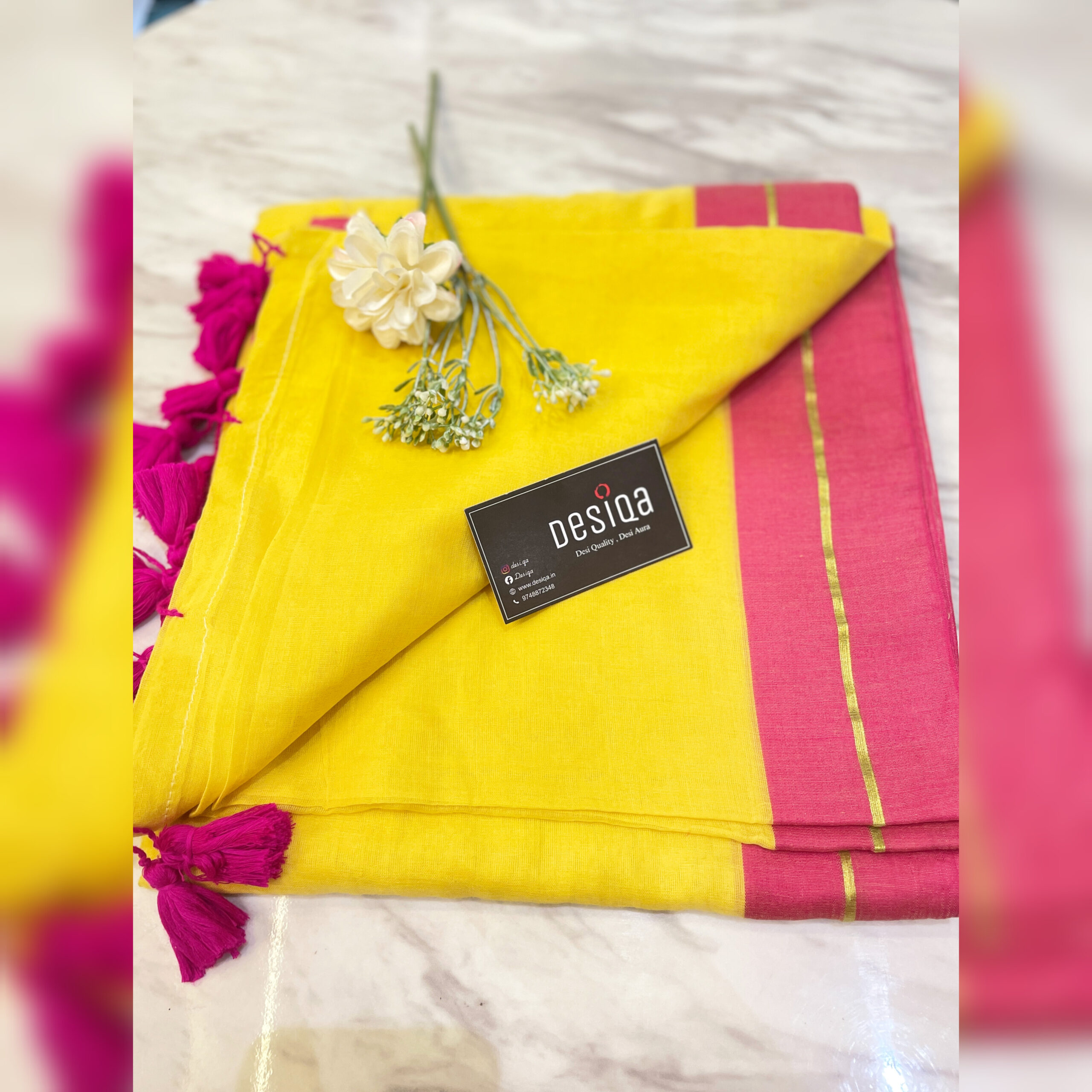 Design:Â Yellow and Pink With Zari Border.
