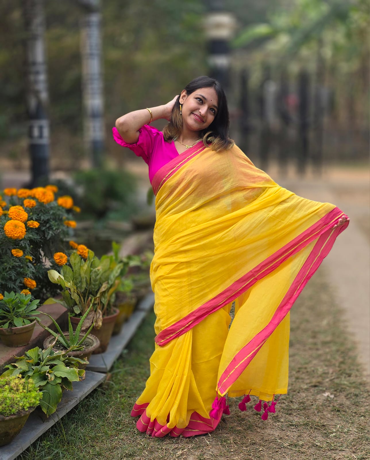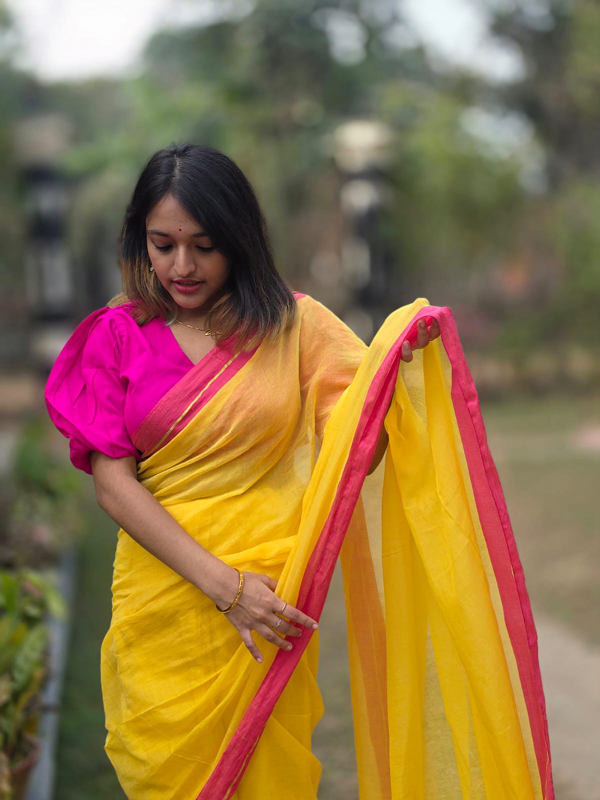 The fabric drapes beautifully and is so light, you’ll forget you’re even wearing a saree! No stiffness, just easy movement.