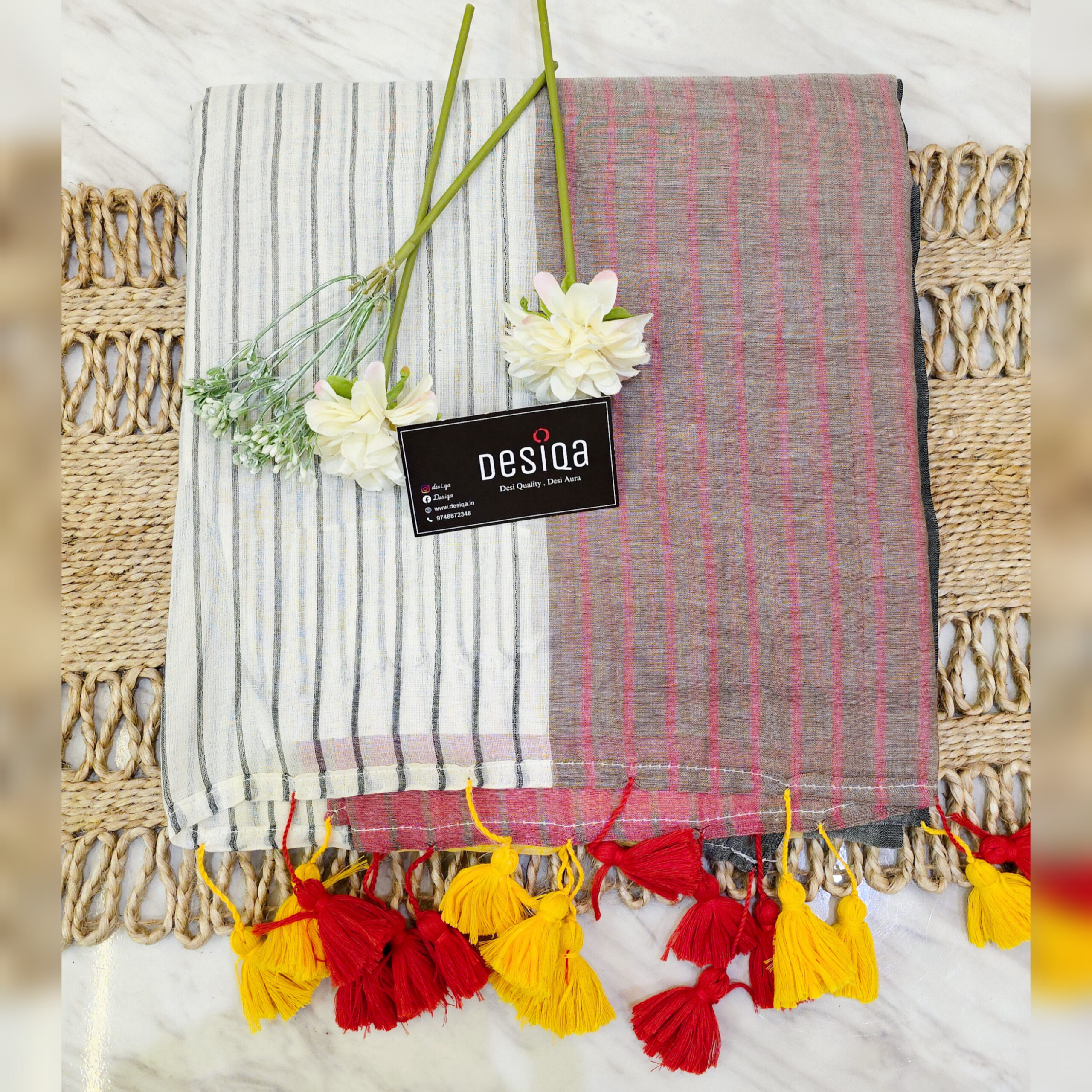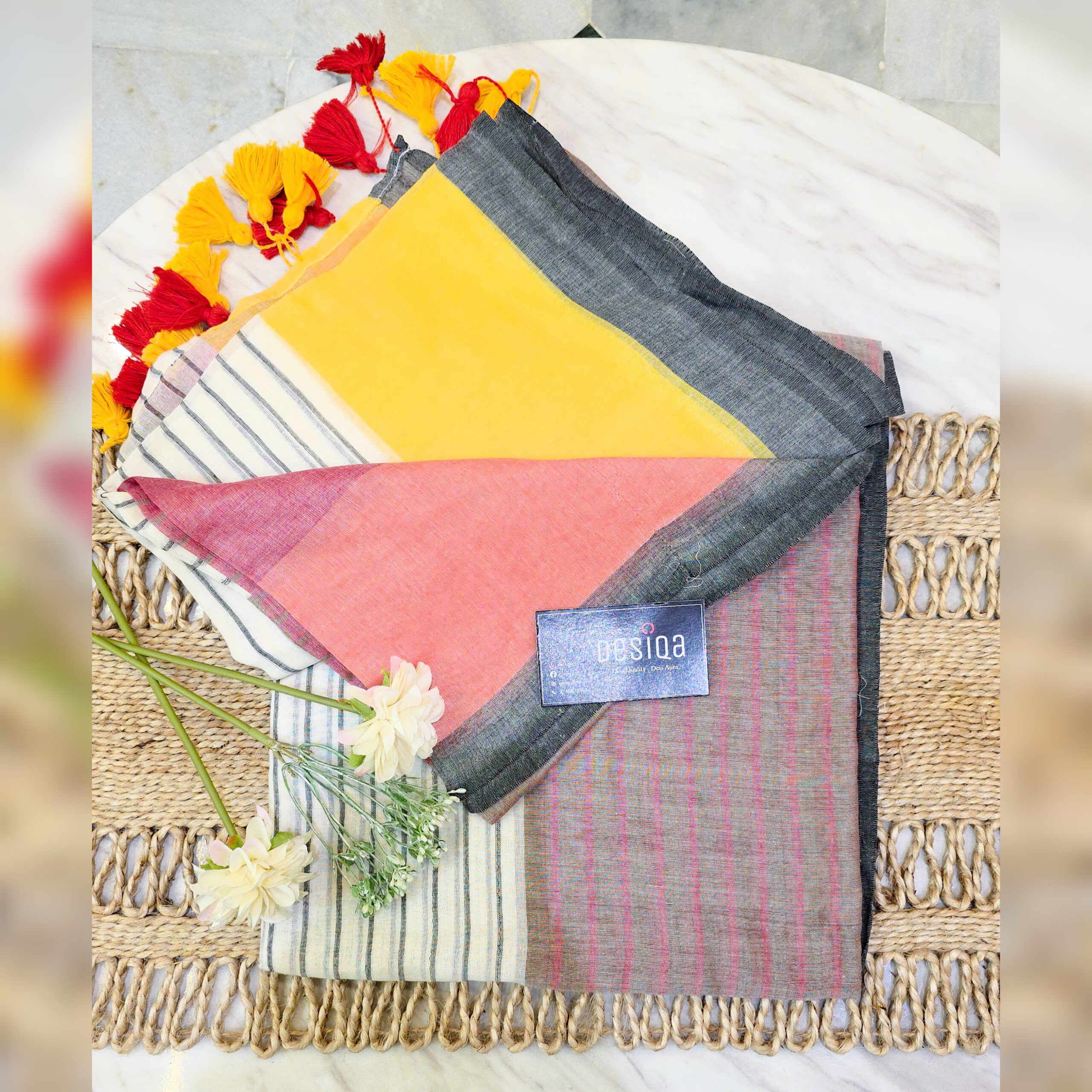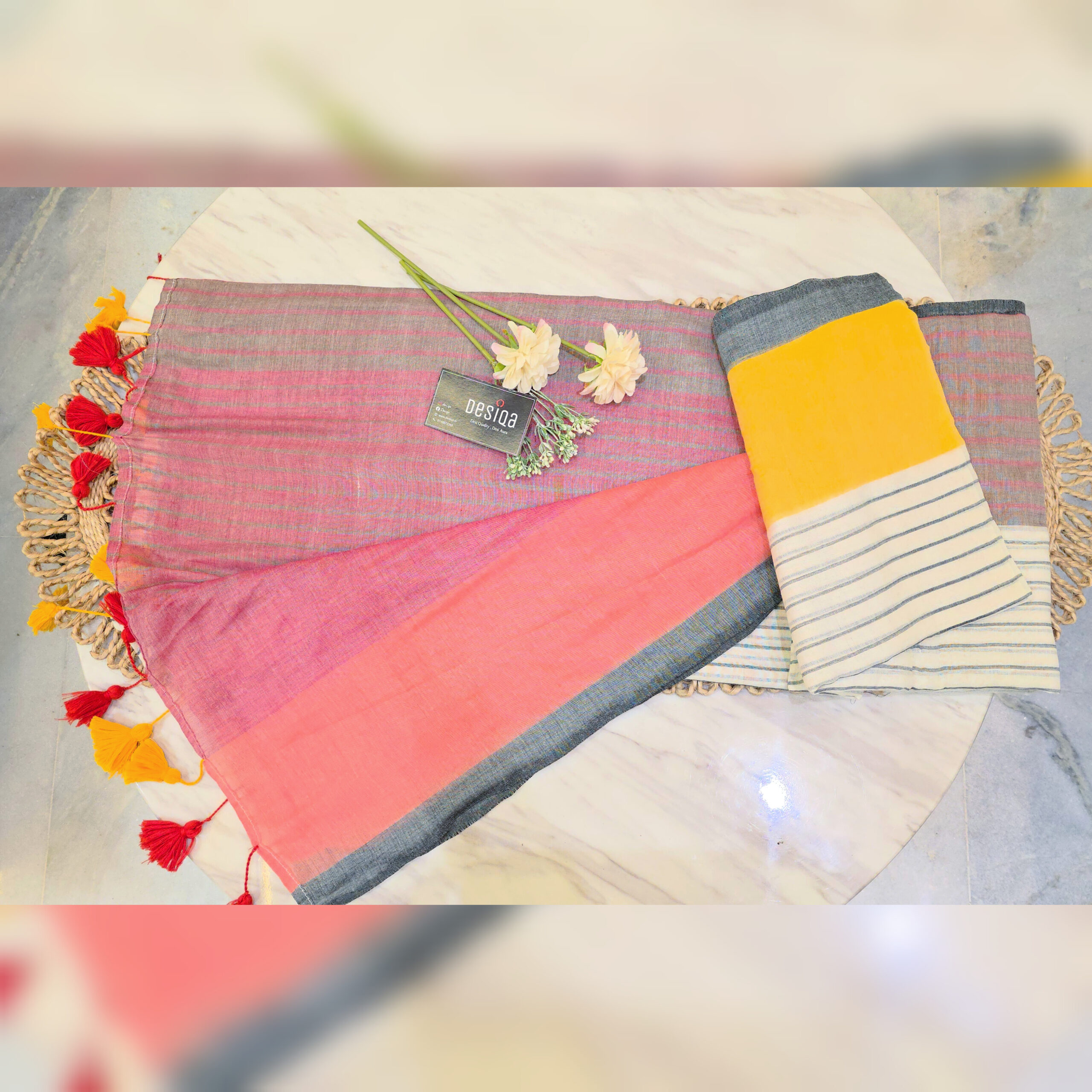 Yellow & White Strip, Pink Body Mul Mul Cotton Handloom Saree